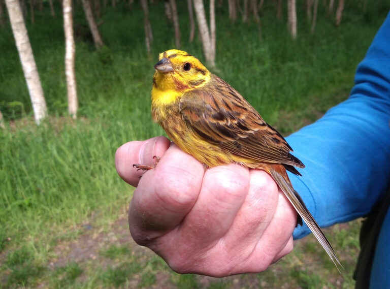 I have mentioned I have a newly qualified ‘C’ Ringer who is now able to undertake ringing without my supervision; she has adopted a wood near Longframlington to start some ringing studies of her own.  Setting up for the first time she had several excellent catches.  One was an adult male Restart almost certainly breeding; that no-one really would guess nested in this wood.  It’s not really the standard open mixed woodland with some oak etc. that they usually frequent.  This species migrates of course to Africa in the winter.  The other was two adult Yellowhammer (buntings) which you might expect to find in a flock on the edge of the wood in the winter but to find them this time of year was interesting.  Further interesting was the fact that both looked ‘male’ based on the brightness of their ‘head’ plumage.  However, closer study suggested one was a female with a very obvious Brood Patch and yes, some male birds do incubate (note the Blackcap mentioned above) but this bird had a very female shaped lower belly.  A subsequent ringing session has found Marsh Tit in this wood; together with lots of Nuthatch and some Bullfinch.