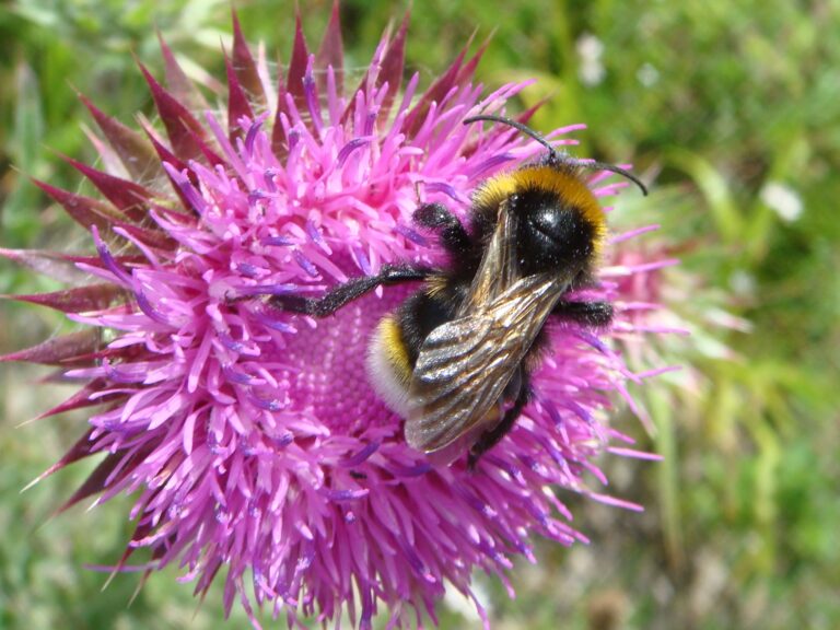 On the Spetchells, Bird’s-foot Trefoil, Ox-eye Daisy and Musk Thistle were the go-to plants for bumblebees. Marjoram was not quite in flower, but over the next few weeks, will be in full bloom on the hills and attracting many bees. A particular highlight while on the hills was a sighting of the Vestal Cuckoo Bee, a scarcer bumblebee in the region. A species of cuckoo bumblebee, females take over the nests of Buff-tailed Bumblebees. While a bit trickier to identify, Richard went through the key ID features of cuckoo bumblebees to look out for. All six cuckoo bumblebees are found in the North East and two species have been recorded at the Spetchells. The Red-tailed Cuckoo Bee, also found on the Spetchells, is a target bee species of the North East Bee Hunt.