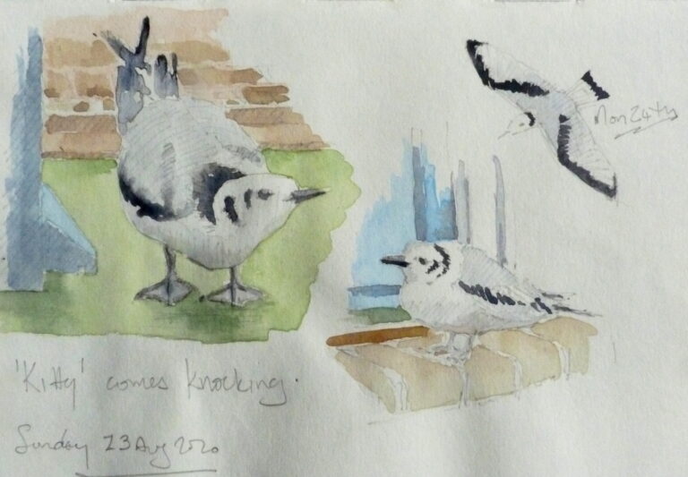 Quite taken aback it took me a few seconds to realise this was a juvenile Kittiwake. I expected it to fly off again but no, it just kept calling. After a while, I was concerned that the local cats may be a problem so I sourced a cardboard box, picked the bird up and placed it in the passage. Having been here before, but that’s another story of a Razorbill swimming in the bath, white fish was defrosted, cut into slivers and consumed. Was woken the next morning by the bird. A day of constant calling and feeding resolved into a plan to take the bird to the quayside, opposite the Gateshead Kittiwake tower and release. This was achieved the next morning and the bird flew off.