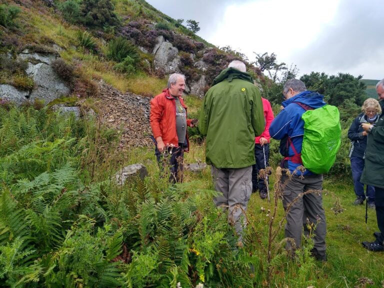 Before reaching Linhope, we looked over the valley and considered the geological history and glacial modifications of the landscape. We then took a footpath heading NE across a field where “Earthwork” is indicated on the OS map. This is Greaves Ash which stands on a spur of land and is apparently of Iron Age date, though occupation probably continued into the Roman period. There are two circular stone-walled enclosures that surround at least sixteen hut circles and are built on altered andesite. To the east is a smaller enclosure that surrounds several hut circles where we investigated granite outcrops.